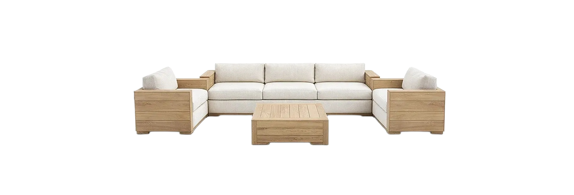 Set di divano angolare da esterno in teak con cuscini in poliestere beige e tavolino
