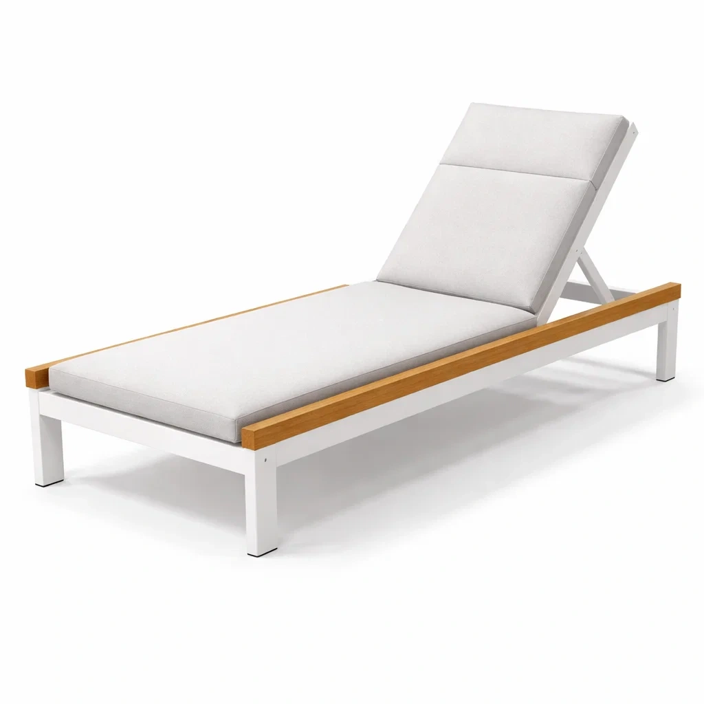 Lettino prendisole in alluminio e legno con cuscino bianco