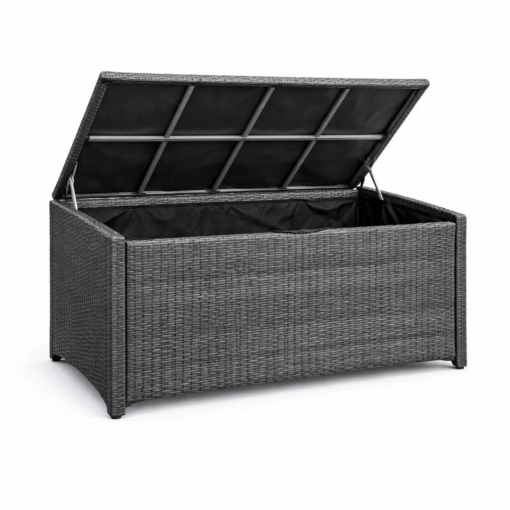 Materiale principale: resina intrecciata in rattan con struttura in acciaio e interno in tessuto poliestere. Dimensioni: lunghezza 150 cm, larghezza 60 cm, altezza 65 cm. Colore: Grigio. Peso netto: 15 kg. Capacità interna: 600 L. Caratteristiche: conservazione impermeabile all'aperto. Manutenzione: pulire con un panno umido, evitare l'esposizione prolungata al sole.