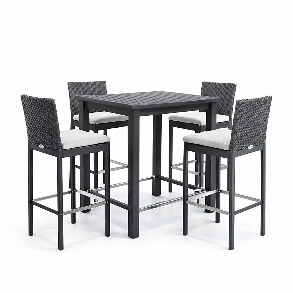 Tavolo alto da esterni con sedie in alluminio verniciato a polvere e rattan sintetico. Il tavolo è realizzato in alluminio con finitura nero, dimensioni di 80 cm di lunghezza, 80 cm di larghezza e 100 cm di altezza. Ogni sedia ha una struttura in alluminio con rivestimento in rattan sintetico grigio e nero, altezza seduta di 76 cm, lunghezza e larghezza di 40 cm. Capacità di carico del tavolo: 50 kg. Capacità di carico di ciascuna sedia: 120 kg. Il set include 1 tavolo e 4 sedie. I materiali sono resistenti agli agenti atmosferici e facili da pulire con un panno umido.