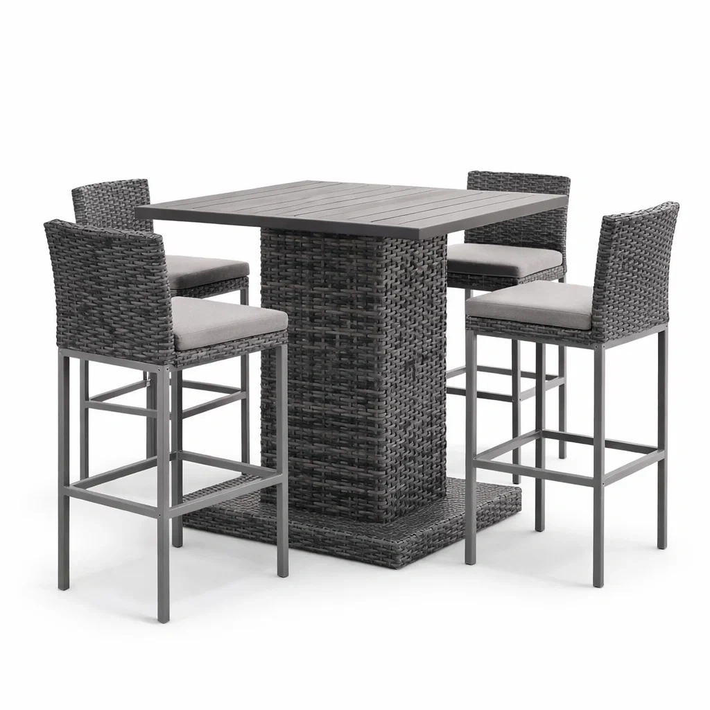 Set da bar in rattan con tavolo e 4 sgabelli grigi per esterni