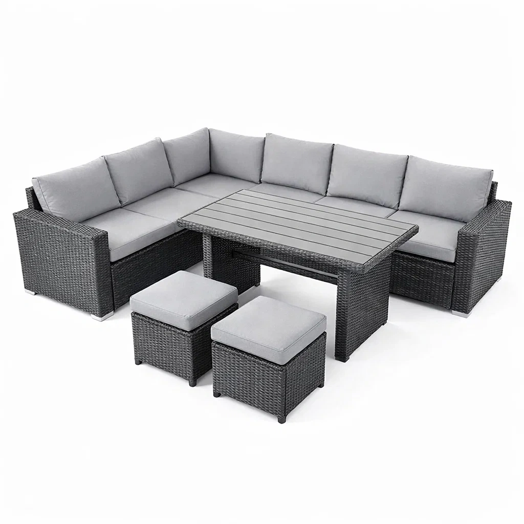Set di divano angolare da giardino in rattan con tavolo e pouf con cuscini grigio
