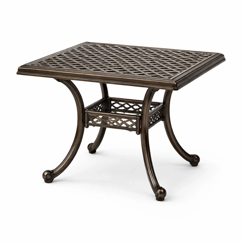 Il tavolo è realizzato in alluminio con finitura verniciata a polvere di colore bronzo. Le dimensioni sono 90 cm di lunghezza, 90 cm di larghezza e 70 cm di altezza, con un peso di 8 kg.